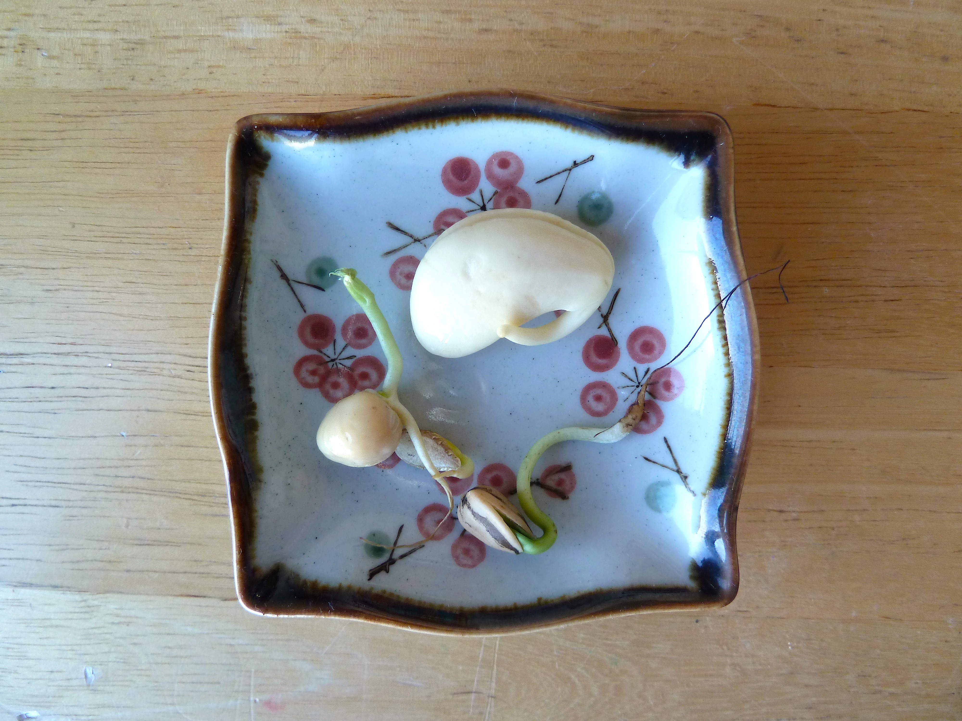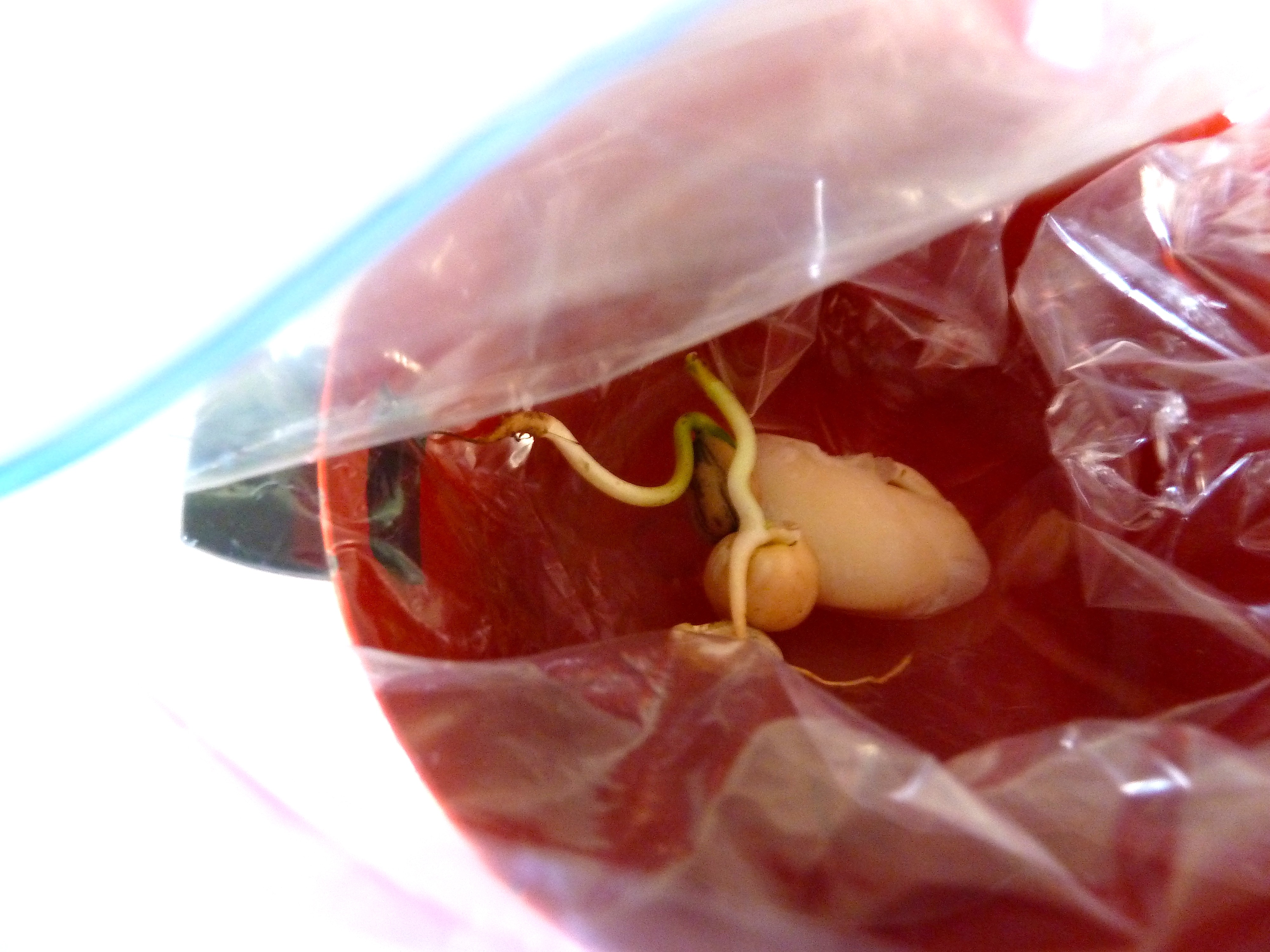 My 3rd grader is learning some plant biology now in school and has brought home a kitchen experiment of her own– germinating, or sprouting, three different legumes. In a very low-tech contraption– a little plastic bag with a moistened towel in it– she is sprouting a lima bean, a garbanzo, and a sunflower seed. It’s been an exciting experiment for her– these beans sprout quickly! She’s got grand plans for growing our own beans just outside the front door, where we already have our immortal supply of scallions growing.