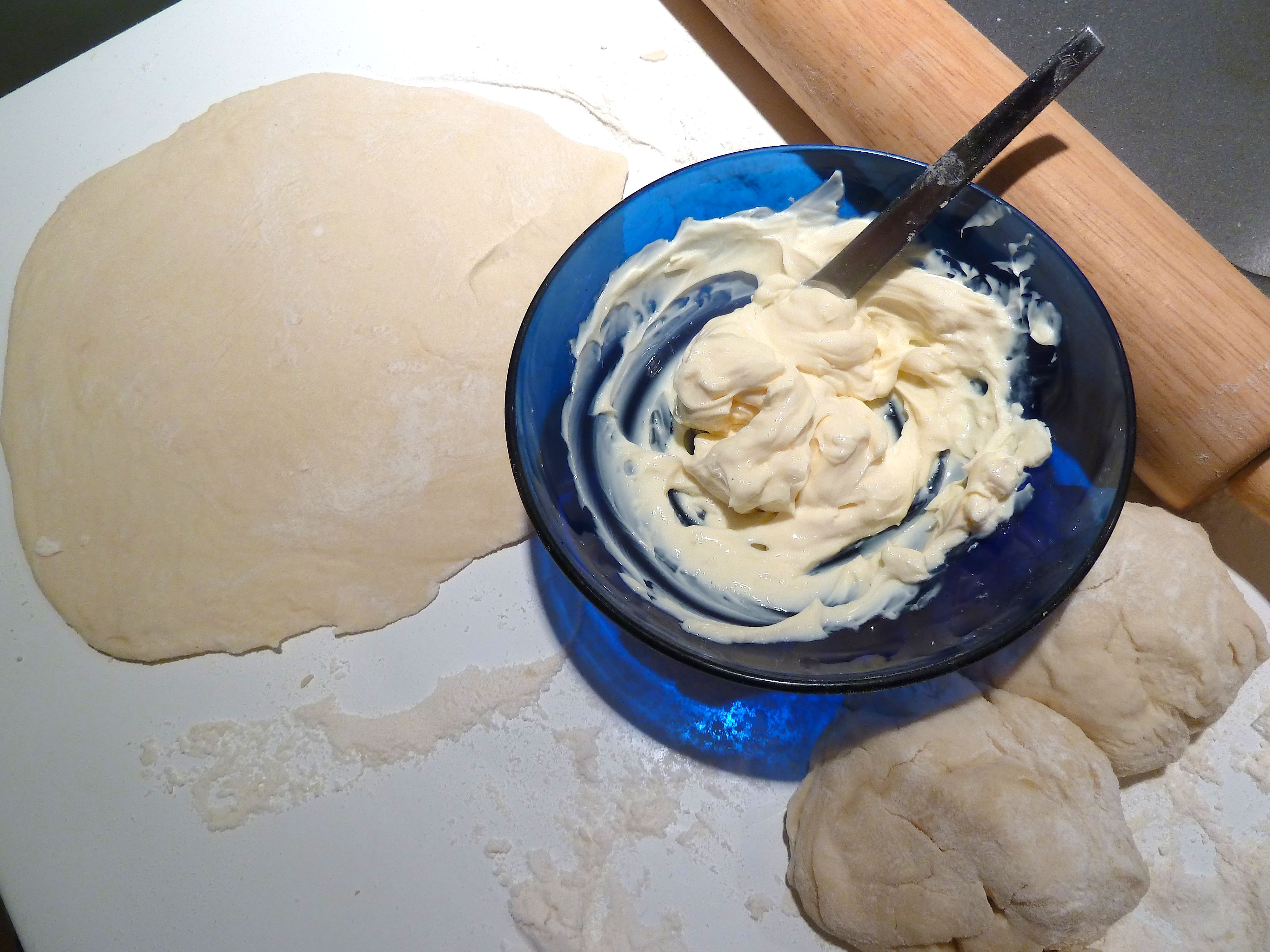 6.  Divide dough into four balls. Roll each ball into a flat circle, then spread an equal portion of the cheese paste in the middle of each circle.   Seal the dough into triangles or circles. Gently press to flatten.