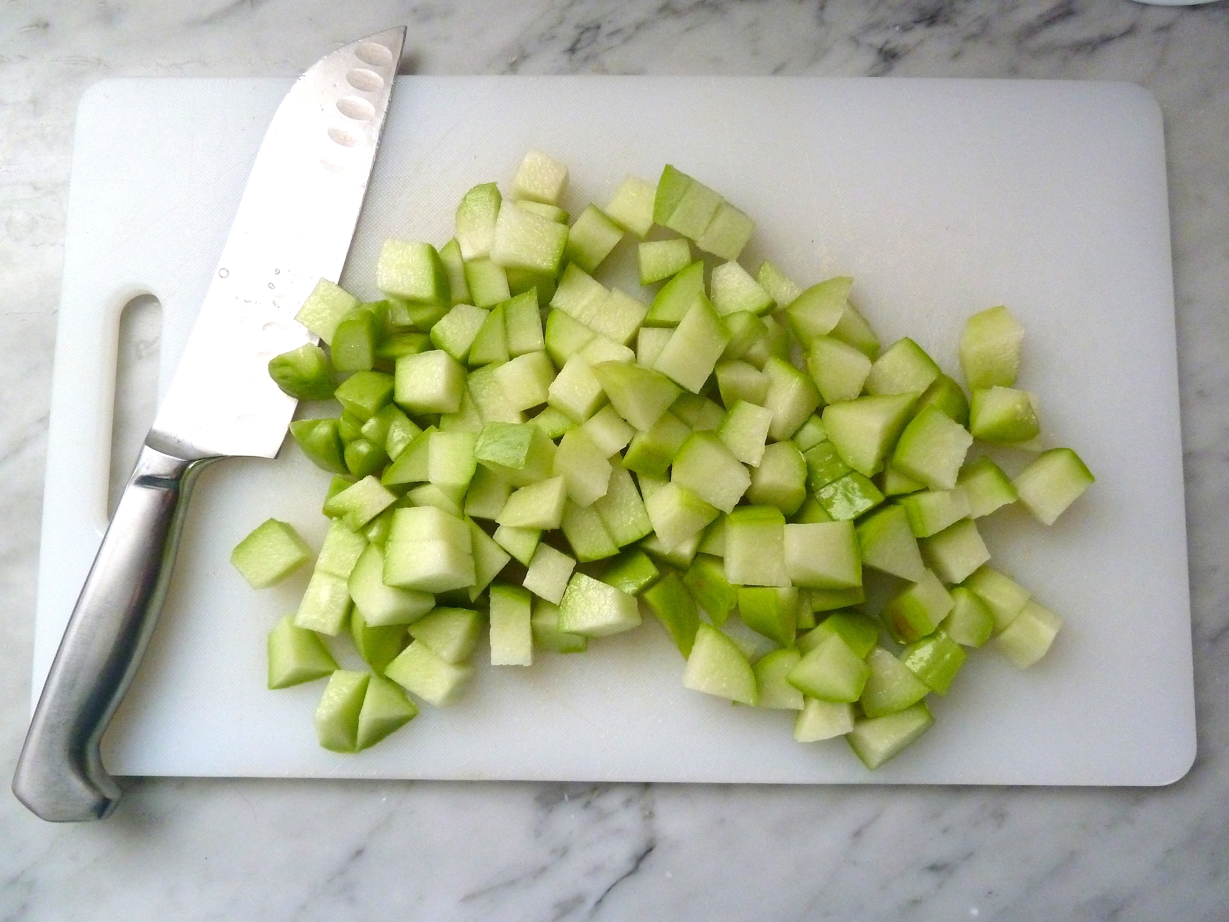 Back home in California, I had no problem locating this fruit in either the bodega down the street or our local Safeway.  I just needed to know the name to search for: chayote.