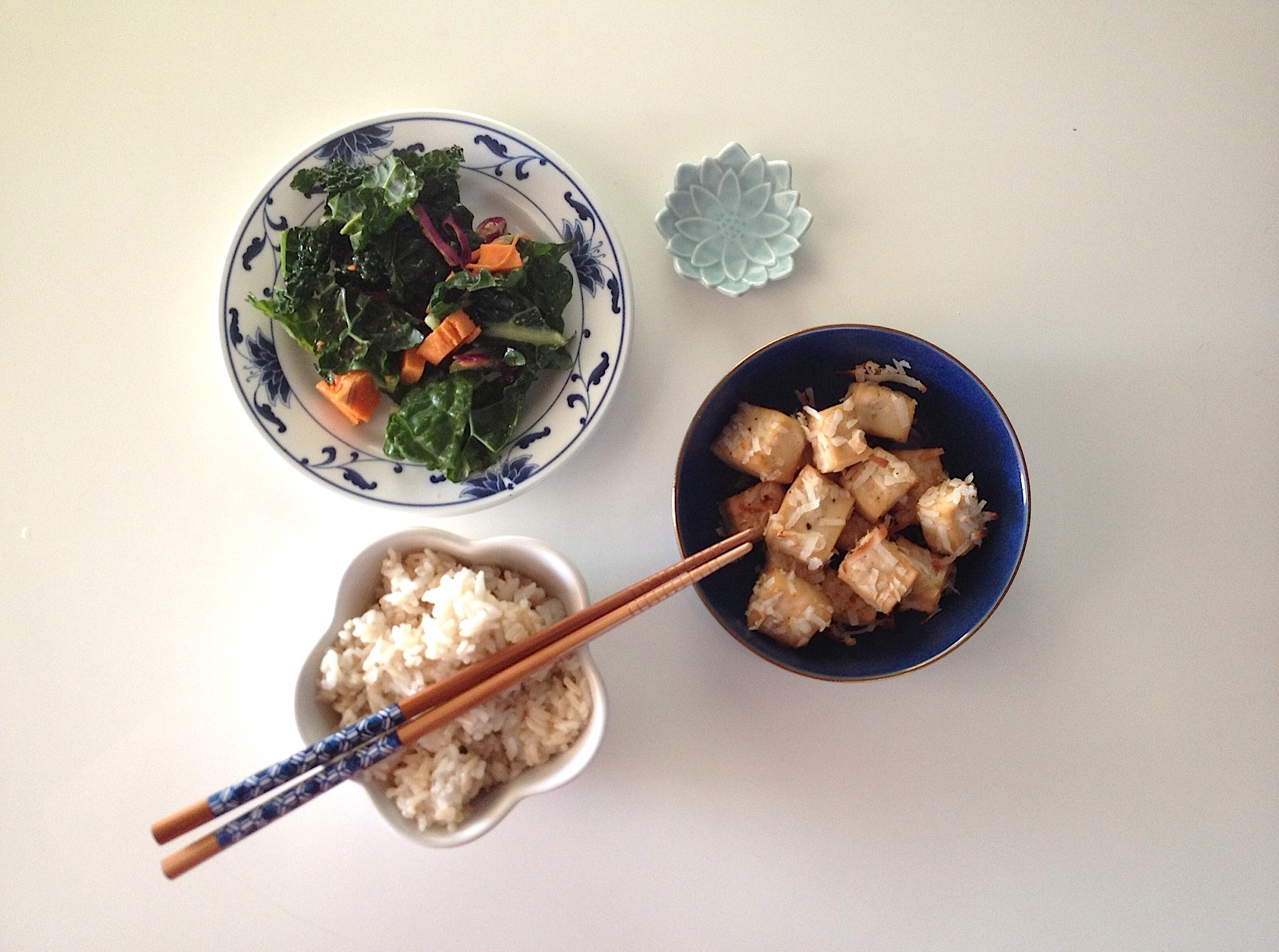 This meal was inspired by an 8 year old vegan. My daughter’s friend, Caycie, is the sweetest little girl, with a face like a porcelain doll, and has been a vegan as long as she remembers. There’s only one problem: she doesn’t like most vegetables! Also, she doesn’t like her food to touch other food. When I sat next to her on a field trip to Chinatown, I watched her carefully put rice on her plate, with a few peas several inches away and a carrot slice or two also set apart. I thought, what does she eat? The answer came many months later, when my daughter came home asking for coconut tofu with coconut rice. Caycie had given her a few bites of her lunch, and she wanted me to make it for dinner. I asked her how it tasted– was the tofu stewed in a coconut milk curry? No. Unsure of the recipe, my daughter said, “let’s look it up on Google images.” (Kids these days!) We did, and chose the recipe which most resembled Caycie’s lunch. I’ve paired it with brown rice steamed with coconut milk and aromatic spices. This is a delicious and satisfying vegan meal, served with a salad on the side. One day, I’ll get Caycie to eat the salad, too.