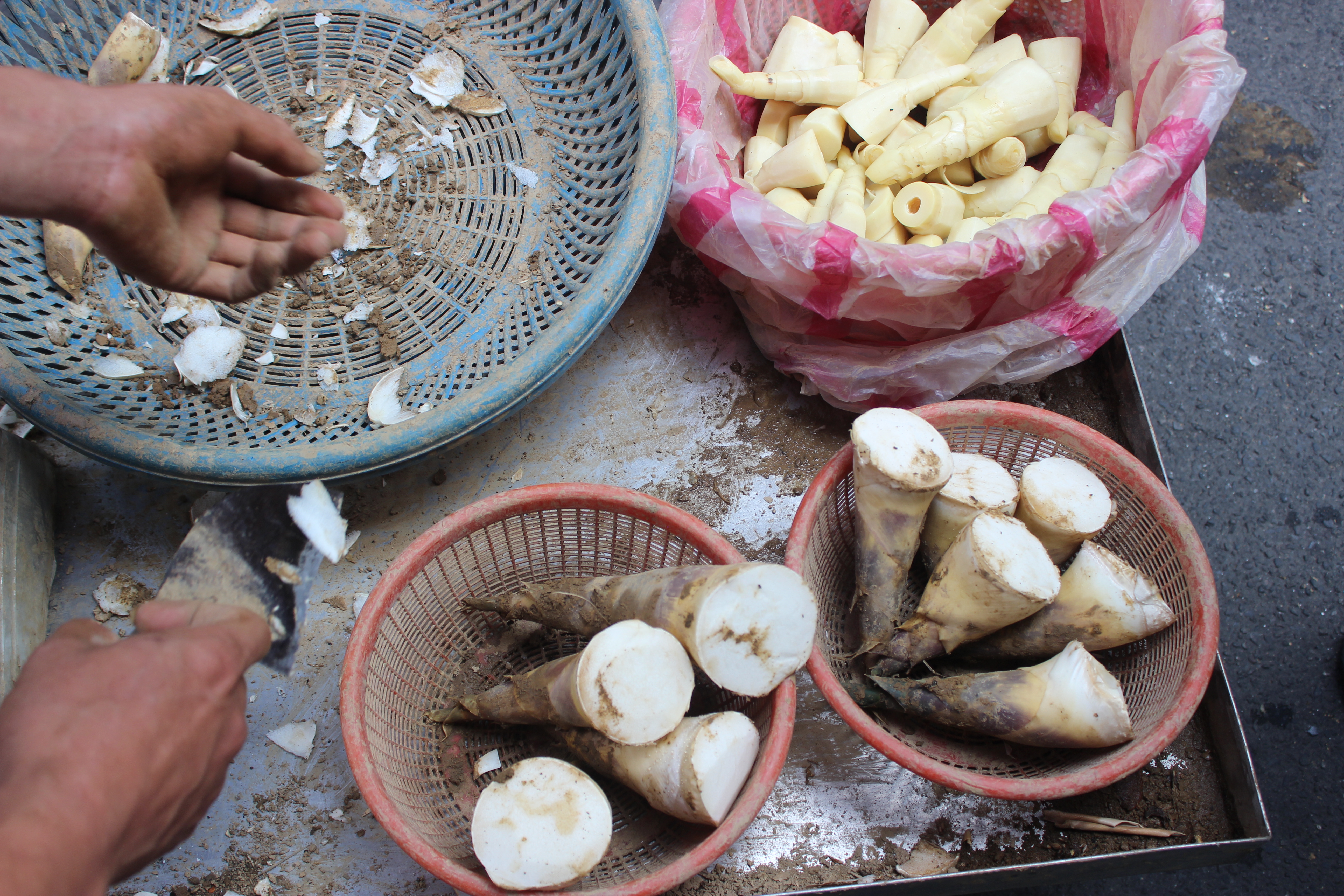I was happy to be around during bamboo shoot season. Here, a vendor is peeling some freshly dug shoots: