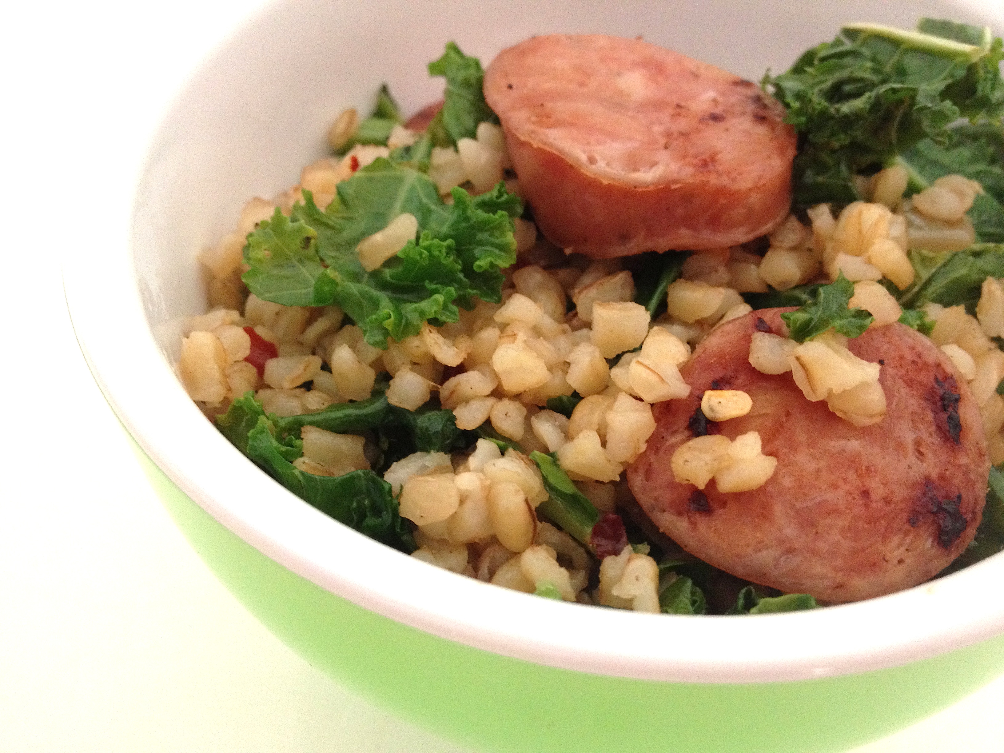 Here is one of the dishes I developed for the class, a one pot meal of kale, turkey sausage and bulgur, one of my favorite whole grains. It went fast!