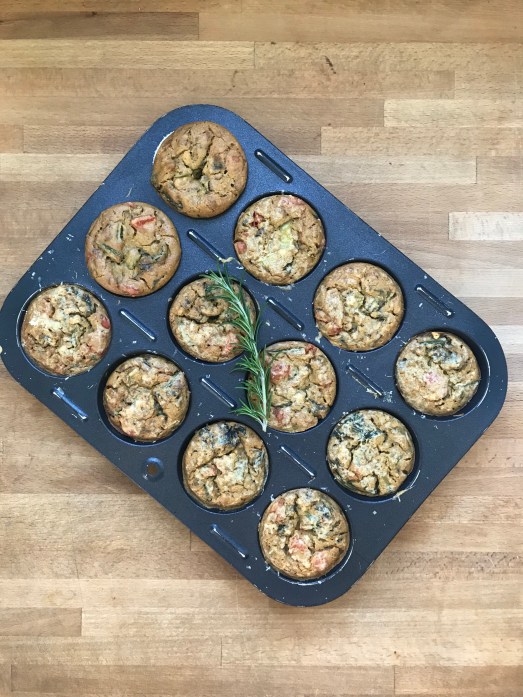 Until last week, when I bought chickpea flour to make socca, I had only had chickpea flour in deep-fried snacks– Indian pakoras and the Trinidadian Indian fritters called pholourie.  An internet search for healthier options revealed that plant based food bloggers often use this savory flour to make eggless quiches and frittatas.  This trend inspired this recipe, which makes a fabulous lunch or, made in advance, grab and go breakfast.  While many recipes call for the addition of nutritional yeast to add a “cheesy” flavor or Indian black salt (kala namak) for an “eggy” flavor, I find those overwhelm the very Italian flavors of tomato, garlic and rosemary, and created this recipe without them.  But you can certainly add those if you like.  And while these are delicious on their own, I highly recommend serving these with some warm spicy marinara sauce for an extra dimension of flavor.