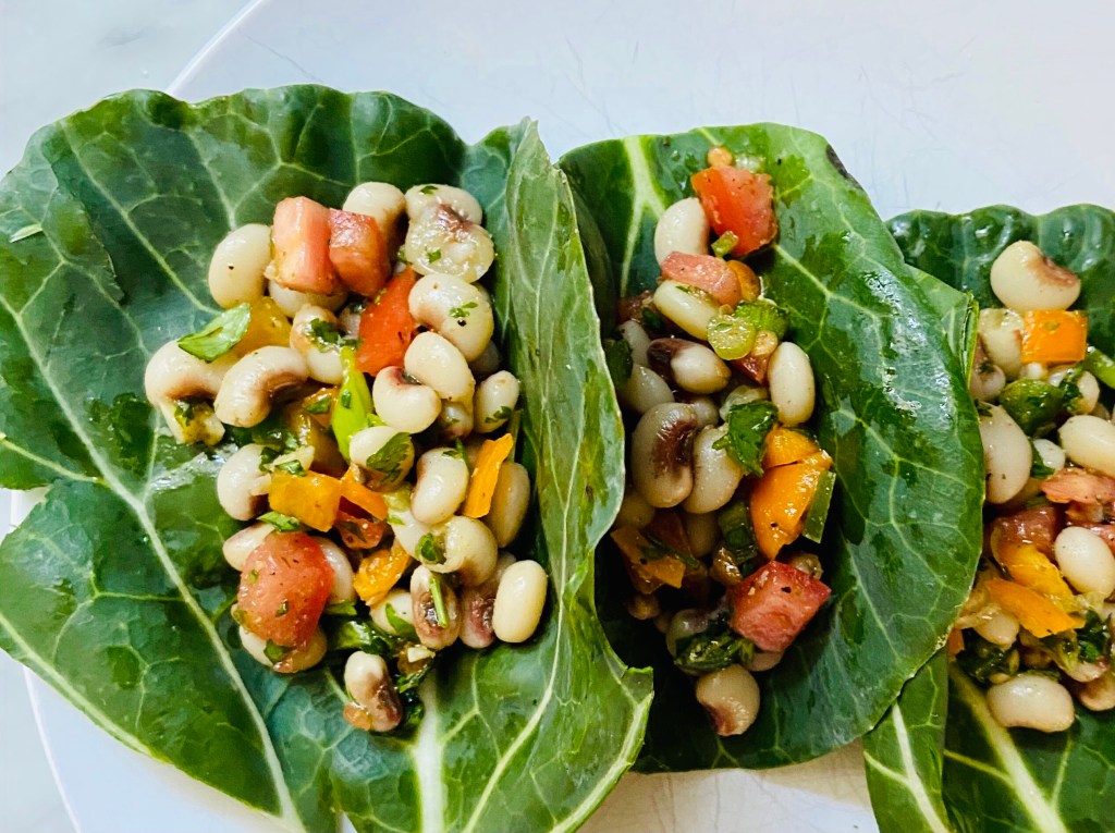 Another tasty way to enjoy black eyed peas is in Texas Caviar, a black eyed pea salad normally served with tortilla chips.  As a variation, you can also make little cups out of raw collard green leaves.  This is a visually appealing and fun way to serve Texas Caviar as an appetizer.