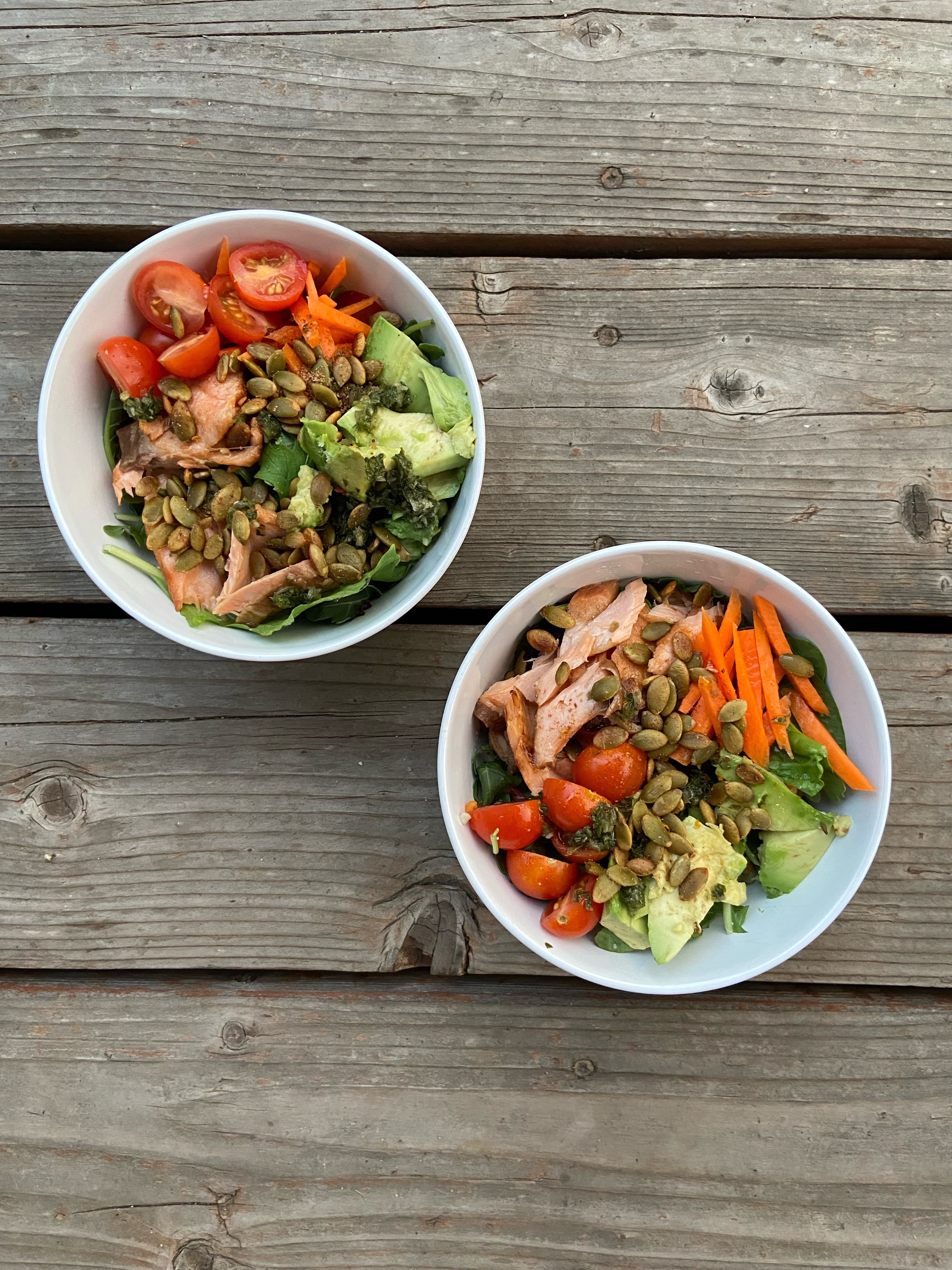 –Love your leftovers– This very delicious grain bowl was really a way to use up leftover teriyaki salmon, bits and pieces of different vegetables and herbs that were no longer camera-ready but still full of flavor and nutrients, and orange spiced pepitas from a recent cooking demo.