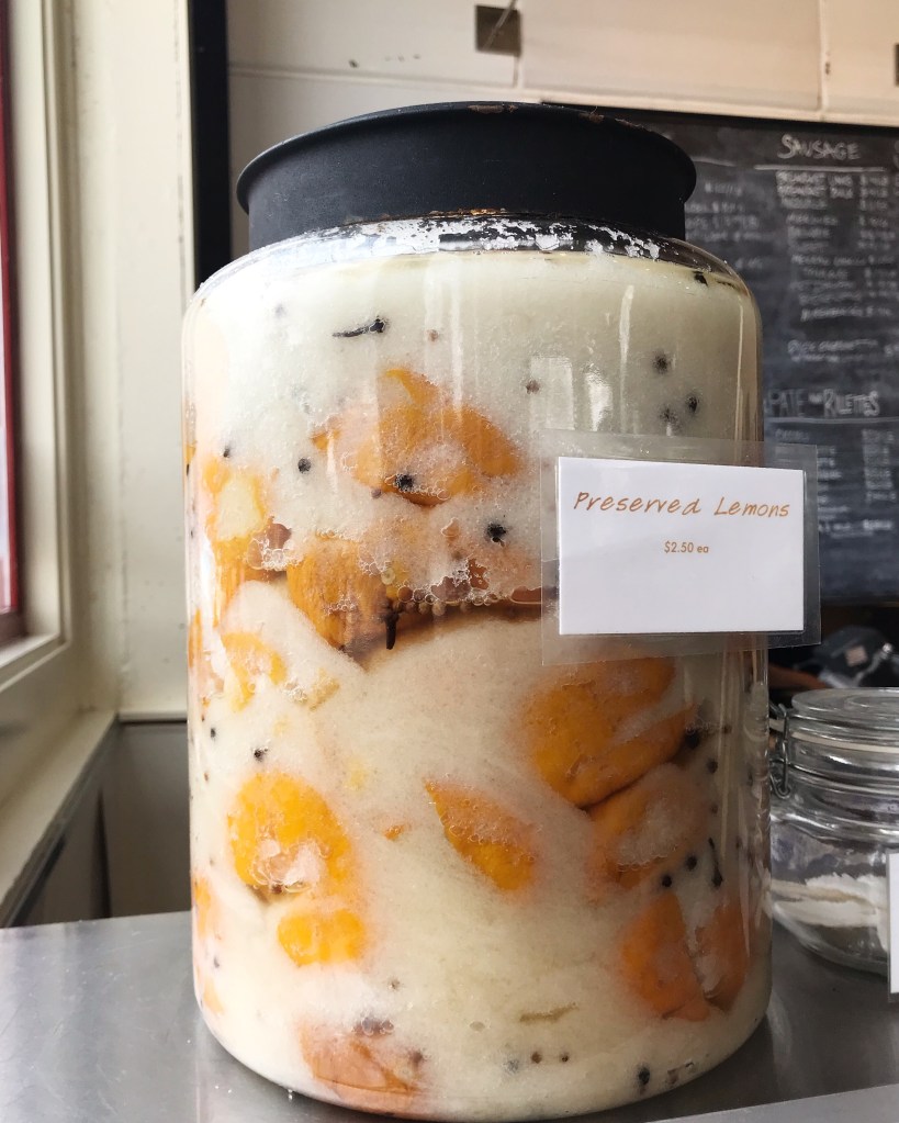 This would be a good time to start some preserved lemons. Lucky if you’re in California and lemons are on the trees everywhere. My method is a little different from how these fine specimens look like they were made, but you can’t go wrong with just two ingredients: lemons and salt.