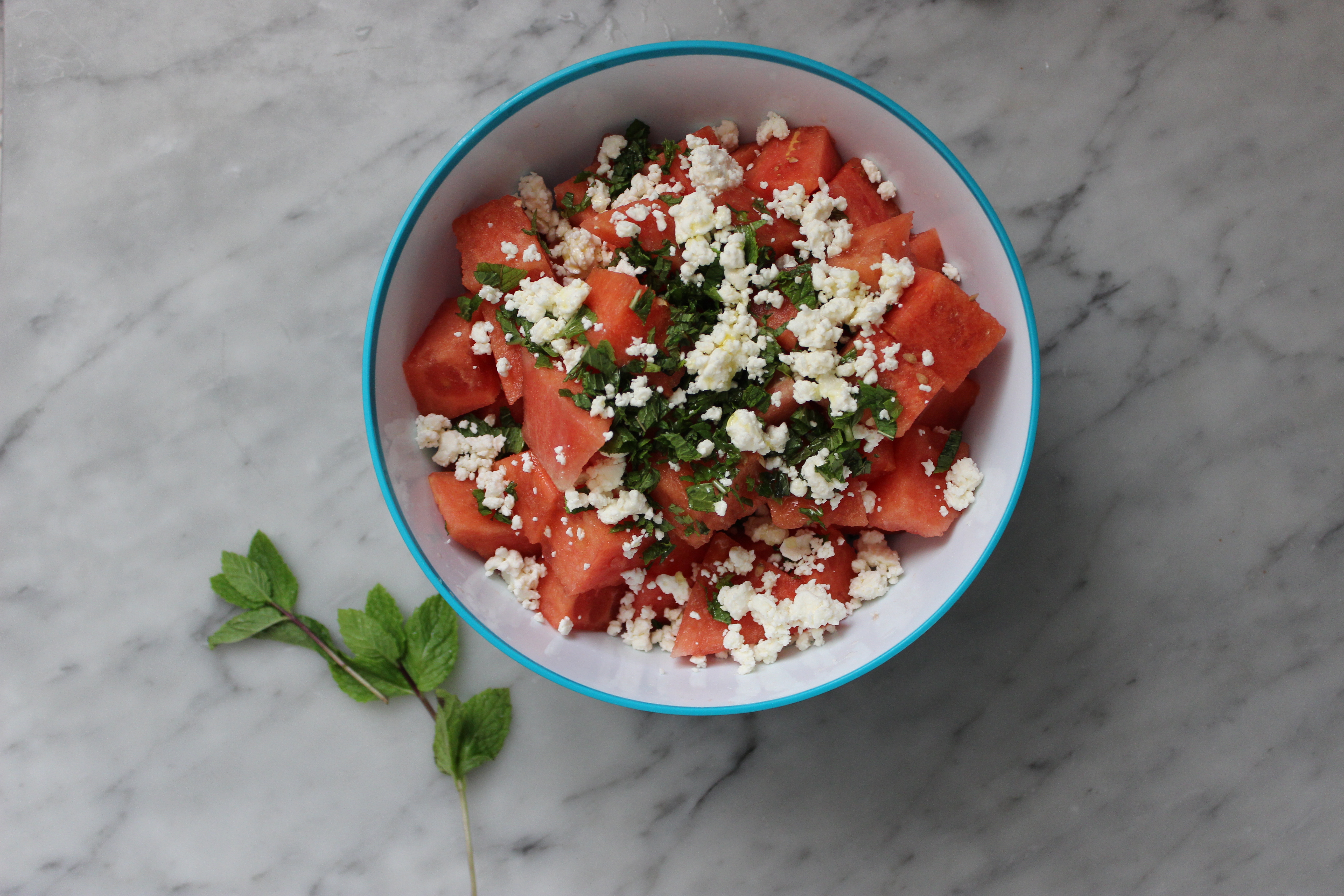 What is more cooling than sweet, cold watermelon? This salad is commonly eaten in the Mediterranean and parts of the Middle East, where the summers are sweltering. is a revelation to those who have never tasted it. At first, the combination seems unlikely– salty feta with sweet watermelon? But one taste, and you’ll be convinced. This salad is an example of the balance of contrasting flavors. I use this recipe for a low-sodium cooking class I teach for patients with hypertension (high blood pressure). Yes, another surprise– despite the saltiness of feta, this is a low-sodium dish because a little feta goes a long way. Bring this to your next summer picnic or potluck, and be prepared for compliments. You don’t have to tell your guests how easy it is to make this or that it’s healthy, if you don’t want to.