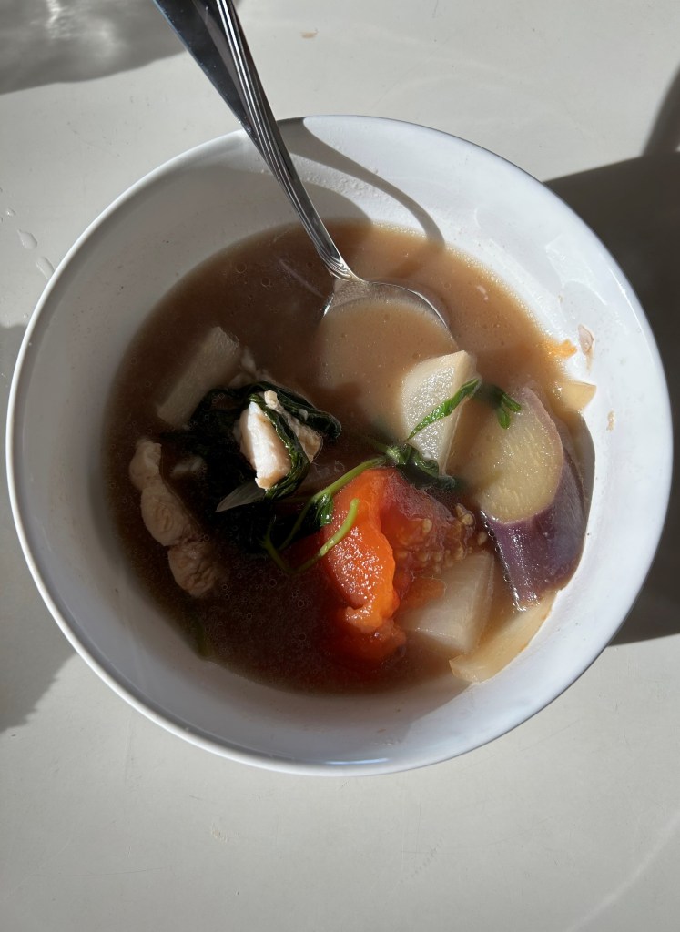 As we close out the month of October (a great month- my birthday month!) I would like to share a recipe from my most recent Thrive Kitchen at Home cooking class for Kaiser Permanente– a special class to celebrate Filipino American History Month. I had so much fun presenting with two of my Filipina physician colleagues, and honored to be allowed to contribute my healthier take on the beloved sour soup, sinigang, as a non-Filipina. This recipe was adapted from two sinigang recipes, mainly from the one I was taught way back in 2014 by Chef Pam Obieta in Manila, with a nice cheffy twist from Chef Angela Dimayuga in the New York Times (adding a lot of sauteed garlic to build the flavor base). This dish celebrates the bounty of very nutritious vegetables in the Filipino diet– kang kung (water spinach or ong choy), tomatoes, eggplant, daikon radish, garlic and tamarind. Making a sustainable fish based version (which could be made fully plantbased with the substitution of tofu) and using tamarind pulp as opposed the very popular but very high sodium sinigang packets from Mama Sita and Knorr brings all the flavor without the sodium, preservatives and emulsifiers that are not good for anyone’s health.