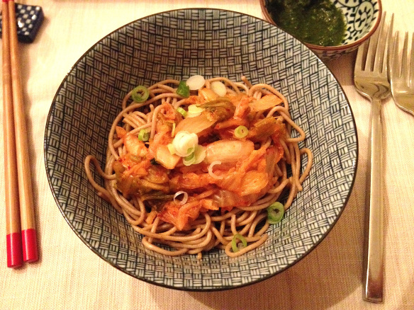 It’s that time of year when the combination of busy holiday preparations, end-of-year work deadlines and dark, sad weather conspire to take away the inspiration to cook. But rather than throwing in the kitchen towel, why not whip up a satisfying but ready-in-a-flash dish? Noodle dishes fit the bill well. One favorite noodle dish features whole grain [buckwheat] soba and the intense fermented flavor of kimchi. This isn’t even really cooking, just assembling. Sometimes that’s all you have energy for, and thankfully, it’s fantastic.